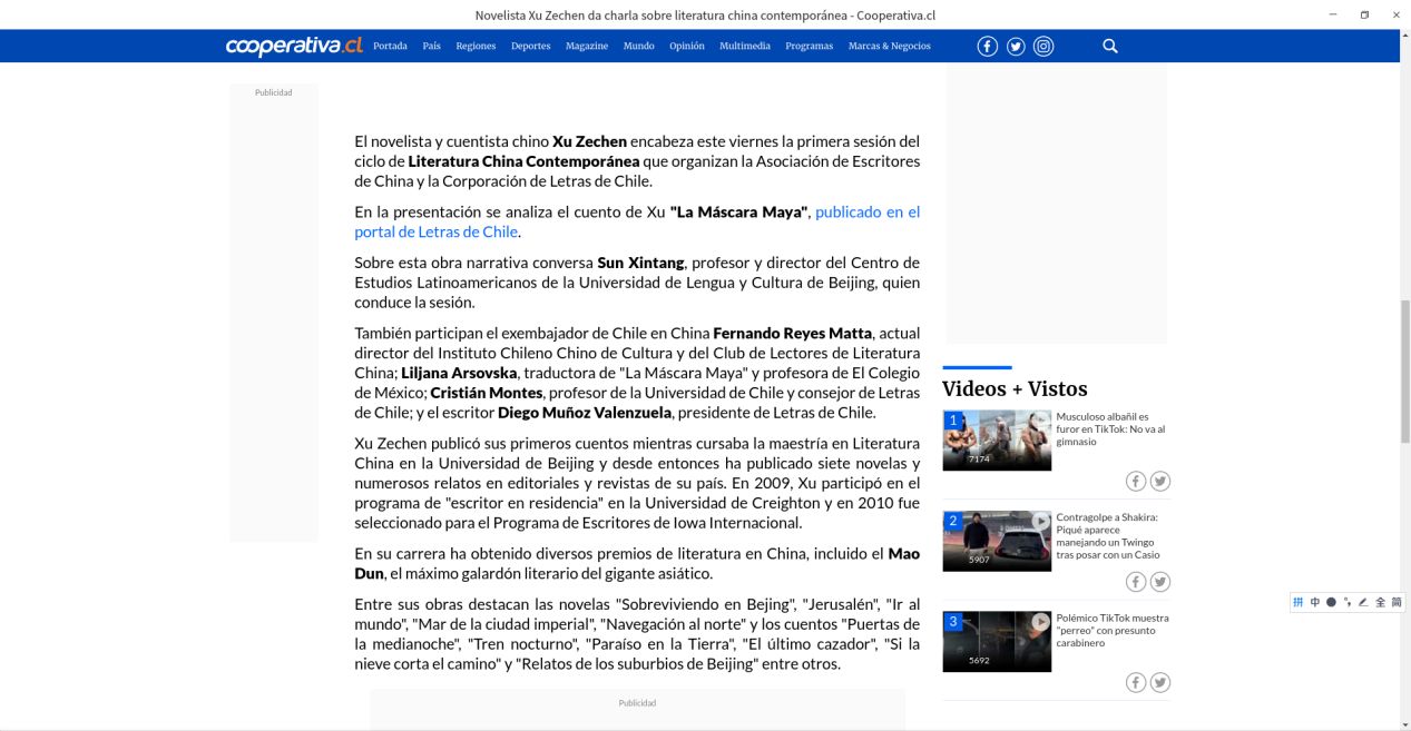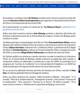 本次分享会在脸书(Facebook)等当地平台进行直播,智利知名媒体“合作社”全程直播和深入报道。为扩大作品影响,小说西文版还在《智利文学网》上进行了全文刊发,为中国当代文学新作快速走进智利及拉美读者群体打开了新的路径。