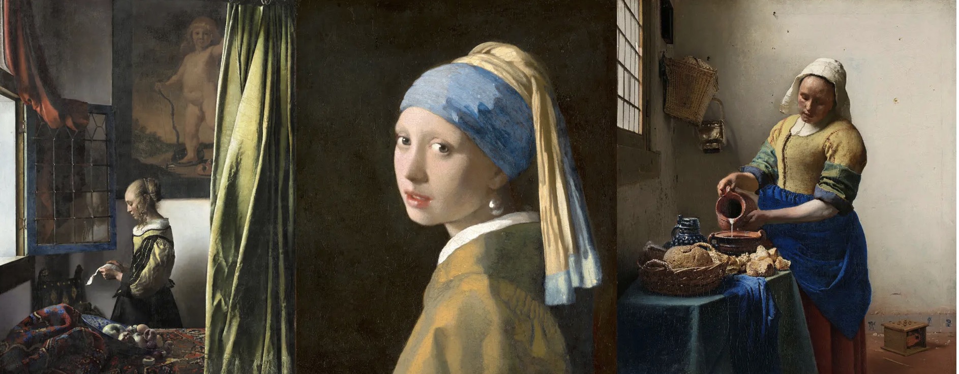 展览作品,左至右依次为《窗边读信的女子》、《戴珍珠耳环的少女》和《倒牛奶的女仆》。