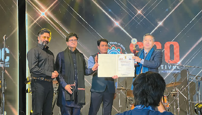 在印度孟买举办的上合组织国家电影节闭幕式上,中国驻印度使馆工作人员(右一)代饶晓志领奖。