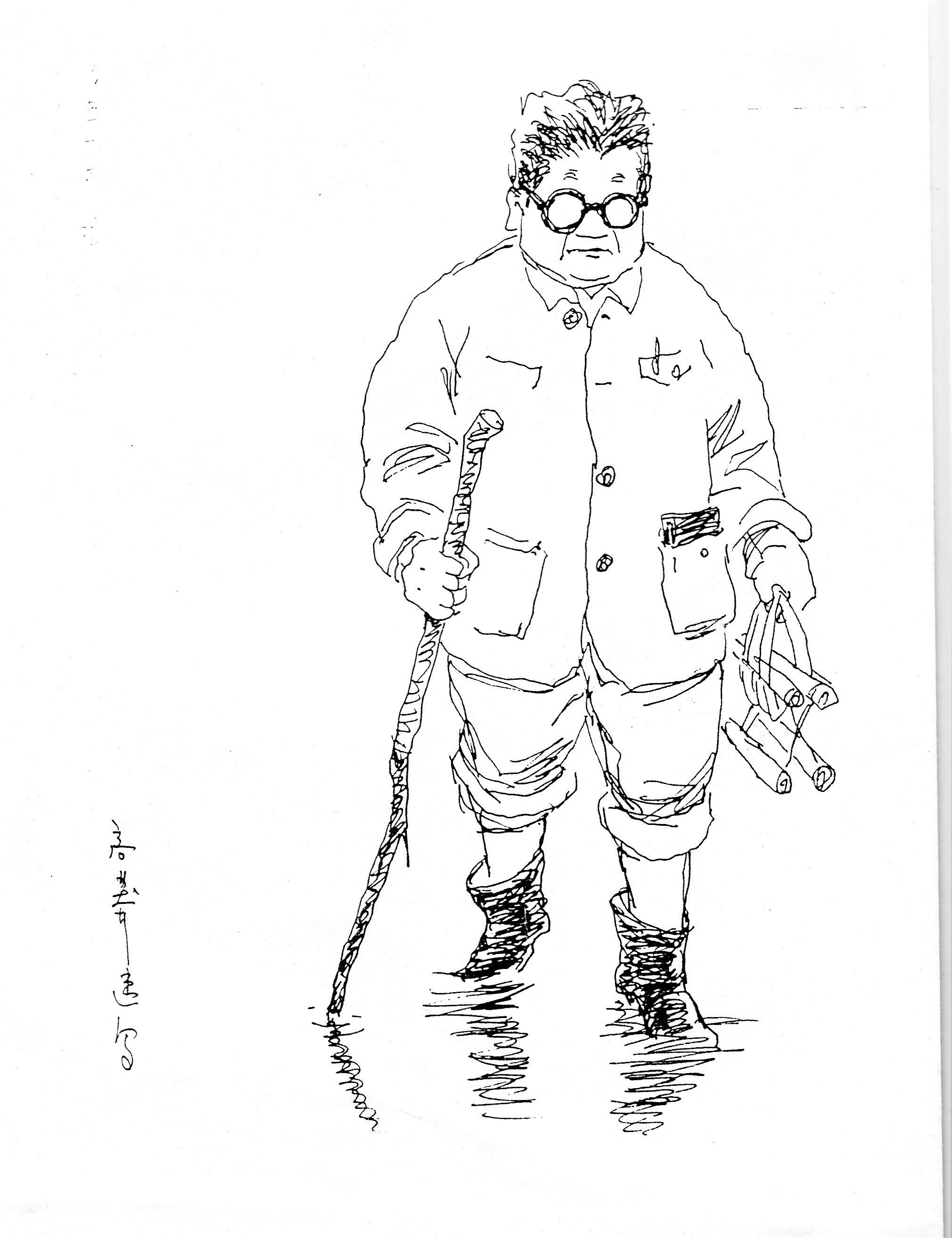 冯至走在泥泞的五七大道上 高莽 速写