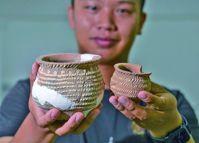 考古工作人员展示甘肃庆阳市南佐新石器时代遗址内出土的箍白泥附加堆纹夹砂陶罐。 新华社记者 李贺摄