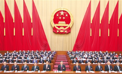 上午9时,赵乐际宣布:中华人民共和国第十四届全国人民代表大会第一次会议开幕。全体起立,在军乐队的伴奏下高唱国歌。
