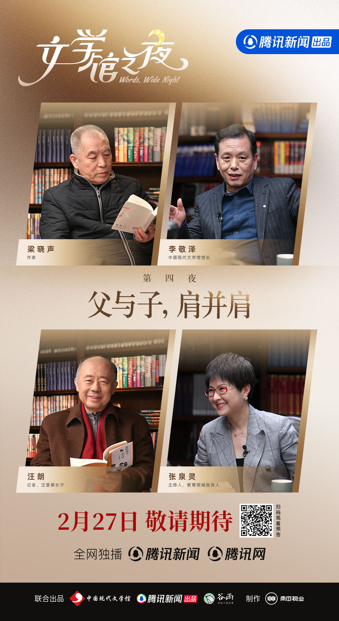 2月26日,随着馆长李敬泽再一次把手与巴金先生的手模印重合,《文学馆之夜》来到了第四夜,节目从这一期起也正式宣告过半。如同清蒸鱼的中段,盛宴中最细腻醇厚的部分被送到观众面前。这一夜,李敬泽、汪朗、梁晓声、张泉灵四位嘉宾的讨论话题是“父与子,肩并肩”。父子关系——一个古老的命题,也是人类的永恒话题,更是百年新文学以来一个常读常新的母题。
