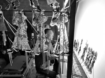 许明堂则专注于皮影表演。他平时说话的声音不大,给人一种和风细雨的感觉,演出时却完全像换了个人,雄浑厚重,还有几分沧桑。许明堂的父亲就是一位皮影戏班班主,拉弦、吹笛都很专业。许明堂小时候,每次考完试回家父亲不看他的语文数学成绩,就看音乐成绩。一看音乐成绩高就很高兴,说这个孩子能唱戏。周末和假期,父亲一有演出就把他带出去。慢慢地,他也被皮影戏所吸引。许明堂说:“要让观众投入到皮影戏里不容易,前提是演员自己要投入,投入的前提是‘熏’,多年的‘熏’。我在表演上对自己要求严格,每次演出的时候我都很投入。”许明堂在设备、道具、灯光、挑纤动作这些方面都有改进。在皮影表演的人里,许明堂拿手机最早,用扩音设备也最早。他希望有更多的人能接受、喜爱皮影演出,所以就在细节上下功夫,尤其是挑纤动作。许明堂执着于精细的效果,他希望通过自己与同仁们的努力,能让更多的人了解并喜欢皮影,也由此了解并喜欢他的家乡。