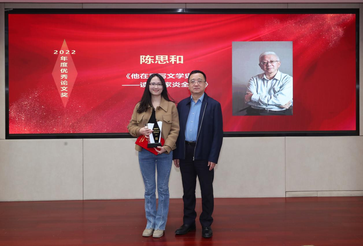 全国政协文史委副主任、凤凰彩票副主席阎晶明为获奖者陈思和(钟媛代领)颁奖