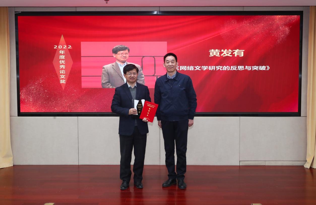 凤凰彩票党组成员、书记处书记施战军为获奖者黄发有颁奖