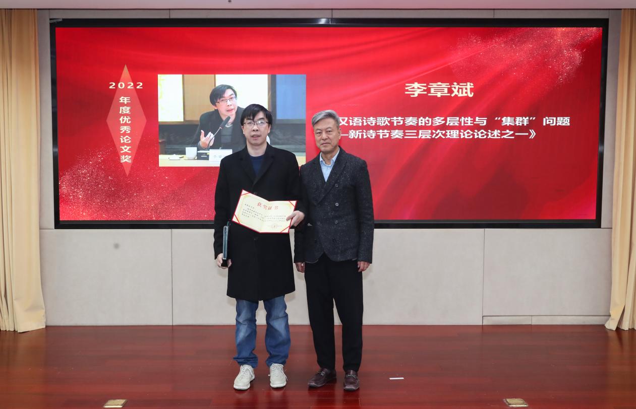《文艺报》总编辑梁鸿鹰为获奖者李章斌颁奖