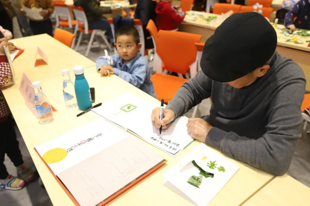 活动现场,有70组亲子家庭参与到叶子画的创作互动中,朱成梁老师为每一位小读者签名作画,合影留念。