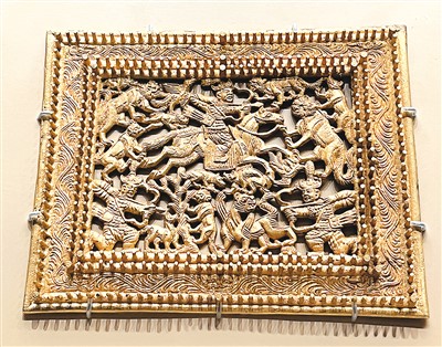 来自宁夏回族自治区盐池县博物馆的狩猎纹金方奇,雕刻十分精美,主体画面表现狩猎场景,造型风格与萨珊王朝金饰颇为相近。根据背面铭文可知,这是十六国时期南匈奴之遗物。