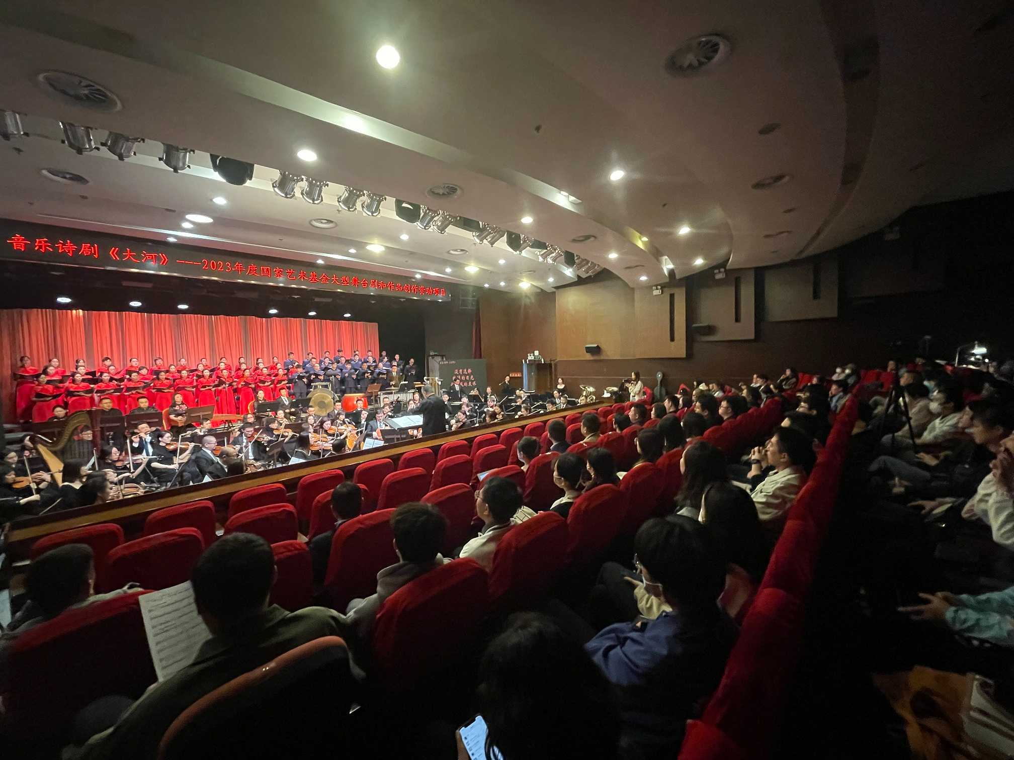 音乐诗剧《大河》以黄河流域生态保护和高质量发展为主题,探索了黄河文化所蕴含的时代价值,传达了对母亲河的赞颂、对生命和光明的礼赞,以及对中华民族未来的憧憬。这部作品是文化和旅游部2022—2023年度“时代交响”创作扶持计划作品,并获得国家艺术基金大型舞台剧和作品创作项目支持。该剧文本来源于诗人吉狄马加的同名长诗,作曲郭文景,戏剧构作尹相涛,特邀指挥家邵恩执棒,中国歌剧舞剧院歌剧团演唱,交响乐团和民族乐团演奏。全剧分为“序曲”“水之源”“春之孕”“和之邦”“天之籁”“海之问”“尾声”七个乐章。