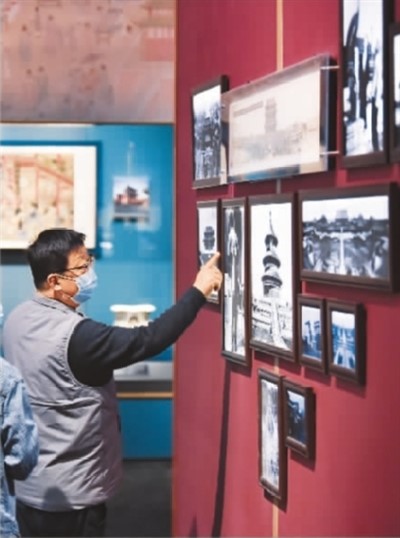 参观者欣赏北京中轴线老照片。
