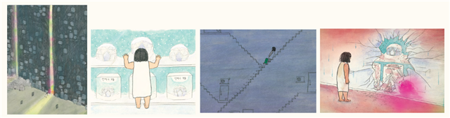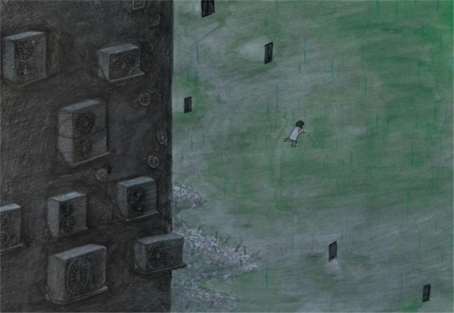 不同于传统意义上雪孩子的形象,《冰房子》中的雪孩子刚出生没多久就遭遇了融化危机。雪孩子并不代表新生,代表的是易碎的梦和难以实现的理想。雪孩子可以是世上任何想要守护的、珍贵的存在。人们都希望自己所珍视的雪孩子能永远活下去,但这种美好的希冀真的能达成吗?安宁达曾在采访中解释自己所画的两个主要意象——冰房子与空房子:“女人跑向城市的时候,有很多只剩下门的空房子。我画那些房子的时候,是想到了随着时间的流逝,远离整个社会而逐渐变得边缘化的少数人群,他们最终被叫作‘城市’的主流社会体系吸收,那些空房子就是不同类型的少数人群留下的痕迹。他们没有守护住自己的东西,被主流社会吸收,只留下一扇扇门的痕迹。当我画出空房子的时候,我看着那一扇扇门,仿佛在看一座座墓碑。”