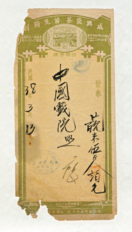 继此之后,袋装茶开始风行。新中国成立之后,像中国茶叶公司、北京市供销合作总社、北京市茶叶加工厂都还生产小袋茶。其实不只是茶,成兴小袋茶出现后,其他袋装商品如袋色、袋烟、袋糖也相继上市,数十年来其道不衰。这些追源溯流,得说是成兴茶庄首开其端。这也难怪当年成兴茶庄的发奉(即发票)上,票首一定要印有“成兴袋茶首先独创”八个大字。