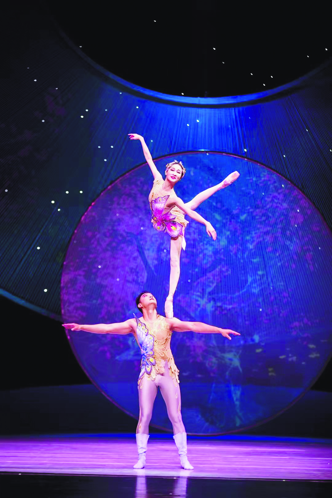 二、杂技剧现在不仅能够比较成熟地展开故事的讲述,还在艺术形式、审美风格等方面做了多种探索。吴桥杂技大世界旅游有限公司的《江湖》用朴素的杂技语言描写了历史上吴桥杂技艺人闯江湖、行侠仗义的人生百态,表现了杂技从吴桥走向国际,从谋生手段提升为艺术表演的蜕变。济南市杂技团的《泉城记忆》以“山水”“人文”“未来”三个篇章,用抒情化的多元艺术语言抒写了济南的前世今生以及未来图景。广州市杂技艺术剧院的《化·蝶》则用唯美的语汇,融合杂技、舞蹈、戏曲的审美,散文诗化地表现了“梁祝”旷世蝶恋的传奇故事。