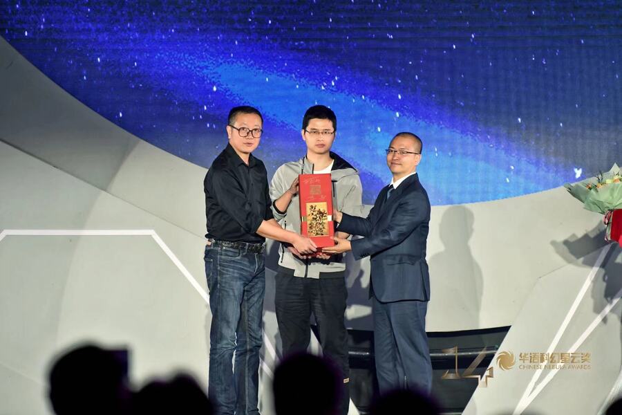 刘慈欣(左一)给“天瑞说符”(中)颁奖