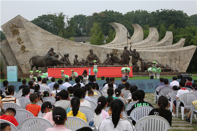 “好一朵美丽的茉莉花,好一朵美丽的茉莉花……”随着少儿表演节目《茉莉花》的开场,中国故事大赛暨少儿文学艺术营地节在清溪村山乡巨变丰收广场拉开了帷幕。丰收广场以周立波的名作《山乡巨变》命名,1955年,周立波回到故乡清溪村,创作出《山乡巨变》等作品,给后人留下了宝贵的精神财富。60多年后,家乡人民为他在村前的广场上竖起一座群像雕塑:在几本如凤凰展翅般的书页前,周立波坐在田间地头与乡民谈心欢笑,劳作的乡民、耕作的牛、成担的谷子和幸福的笑容,象征着丰收的喜悦。雕塑生动展示出作家“深入生活、扎根人民”的创作立场。