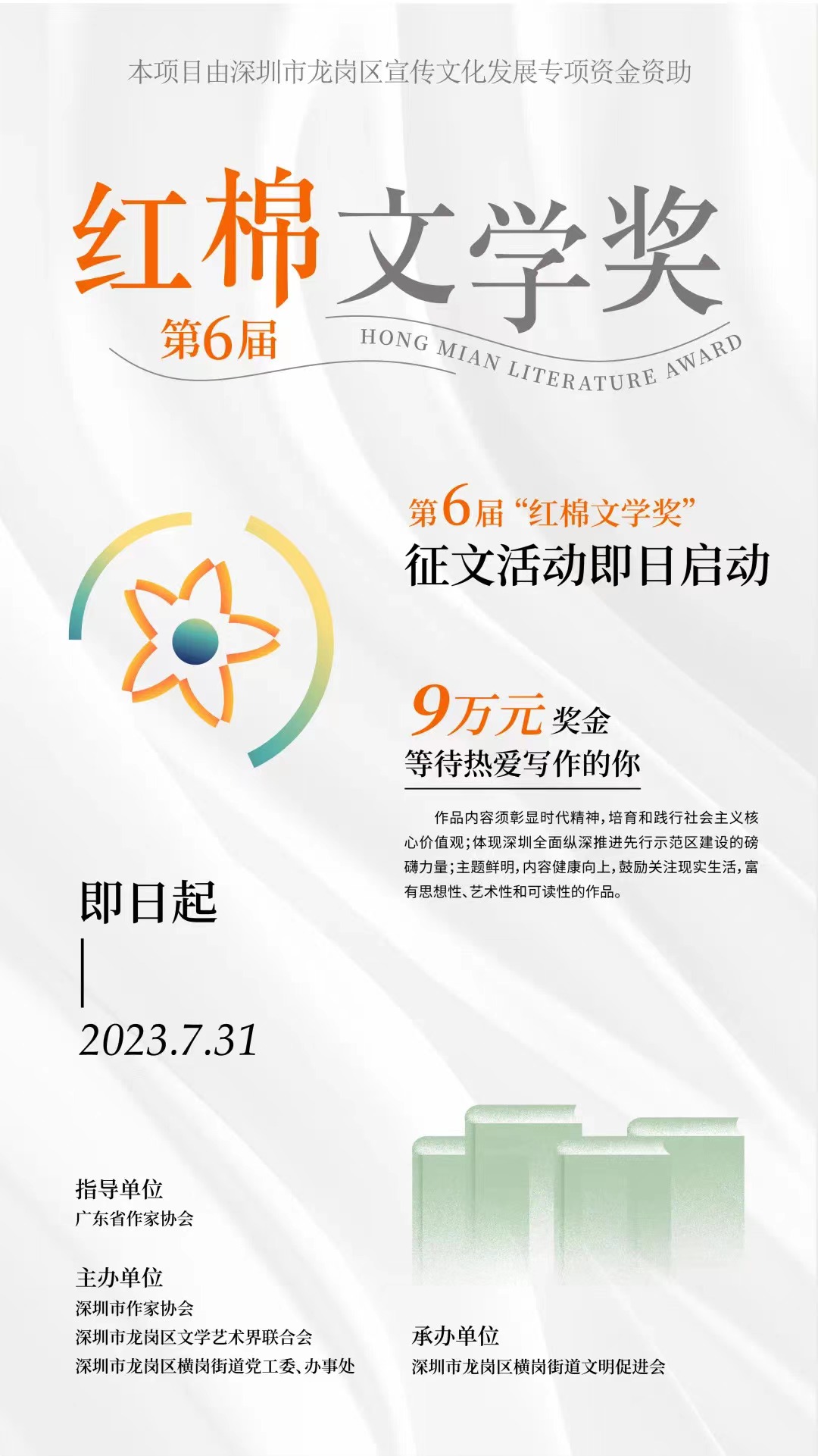 为深入学习贯彻党的二十大精神,助推新时代文学高质量发展,讲好中国故事、传播好中国声音,展现可信、可爱、可敬的中国形象。彰显深圳先行示范作用,弘扬社会主义核心价值观,发现推介当下原创文学精品力作,第六届 “红棉文学奖”征文活动即日启动。
