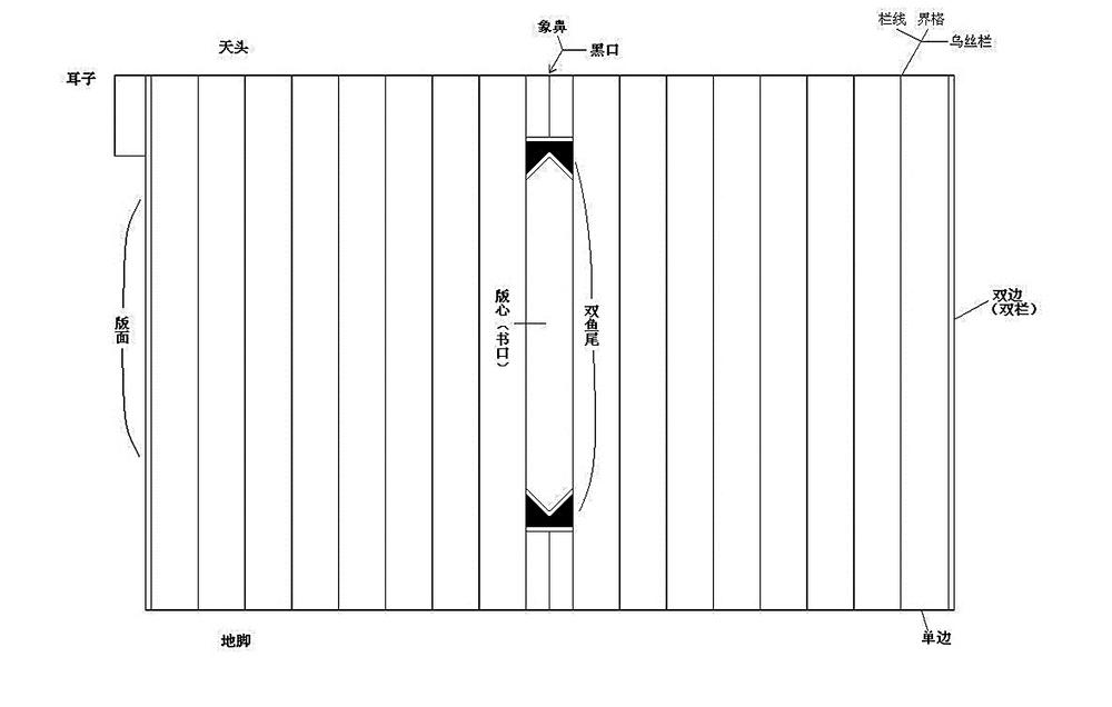 翻开古籍之后,随之展现的是版框。书版四周的界限叫栏线,上方叫“上栏”、下方为“下栏”,两边为“左右栏”或“双边”,单线叫“单栏”或“单边”,双线叫“双栏”或“双边”。行格栏线多数是黑色的,但也有朱色,以醒目区分。如明代《永乐大典》就是这样。鉴定版本时,应特别注意行款,即版面的行数和每行的字数。行款通常以每半页计算,称“每半页若干行,行若干字”等。不同时期、不同地点,行款往往不同。清代江标著有《宋元行款表》用来考证版本。古籍每一版中间折缝处称为“版心”或“书口”。书口印有黑线的称“黑口”,不印的称“白口”;黑线粗的称“大黑口”,细的称“线黑口”或“细黑口”;刻在上栏下的叫上黑口,刻在下栏上的叫下黑口。版心中间往往刻有书名、卷次、叶数。在版心下方还常刻有书铺名或刻工名。象鼻指黑口本版心上下的黑线,如同象鼻垂在胸前。版心折缝处还常常刻有各种符号,形似鱼的尾巴,故称“鱼尾”;种类也有黑鱼尾、白鱼尾、线鱼尾或花鱼尾。