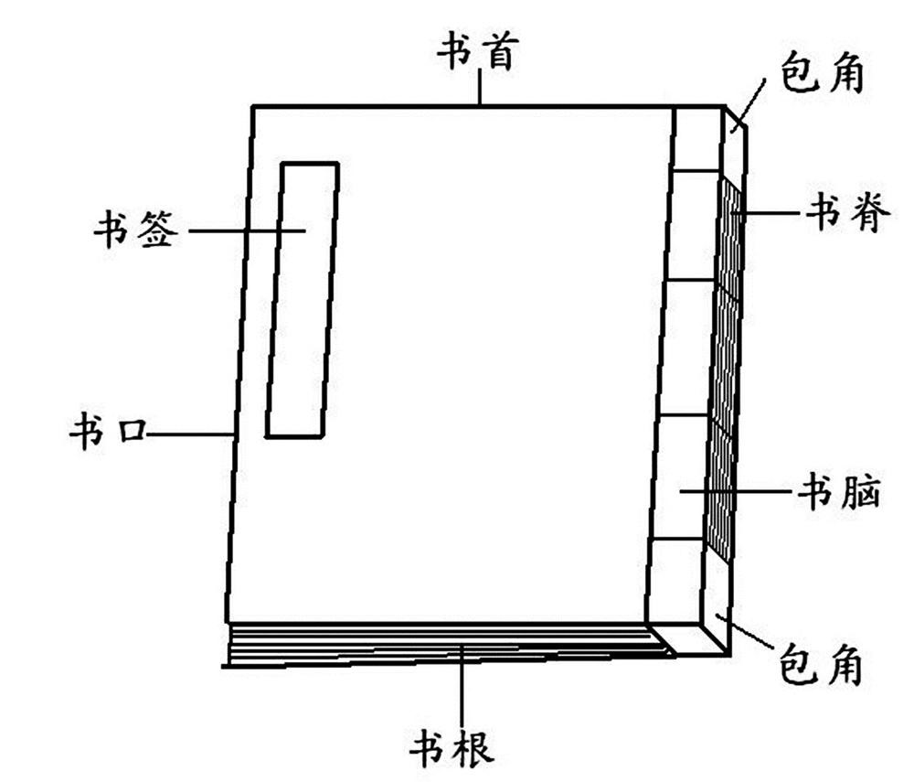 书首、书根、书脊、书口是指书的四周部分。包角是对那些比较珍贵的书,在装订时用湖色或者蓝色的绫子将书角包起来,起到保护的作用。在江南,许多藏书家往往不用包角,因为容易生虫。书签或是纸制的,也有用丝织品的,用来题写书名。有的书签会特请名家书写,显得美观典雅。