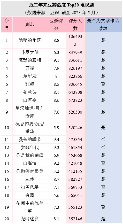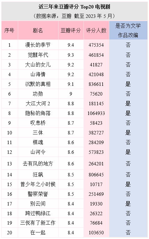 综合考量豆瓣评分与评分人数,近三年评分前20名的国产剧中,文学改编作品有7部,占比为35%。个别作品可能有改编之实但未公开认定者未计入内。2020年,《沉默的真相》《隐秘的角落》《大江大河2》《别云间》四部文学改编作品进入豆瓣评分前10名。21年评分前10名中有1部,为《山河令》。2022年评分前10中,有《人世间》《风吹半夏》《风起陇西》《苍兰诀》,共4部。2023年评分前10名中,有4部文学改编作品(截至2023年5月)。 仅仅从豆瓣评分来看,优秀的文学改编影视作品,总体影响力尚不能完全与原创影视作品分庭抗礼。