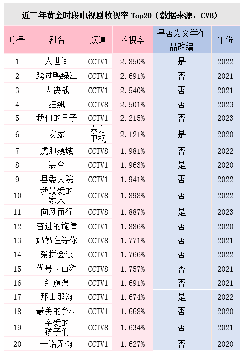 3.电视黄金时段收视TOP20中的文学改编占比:25%