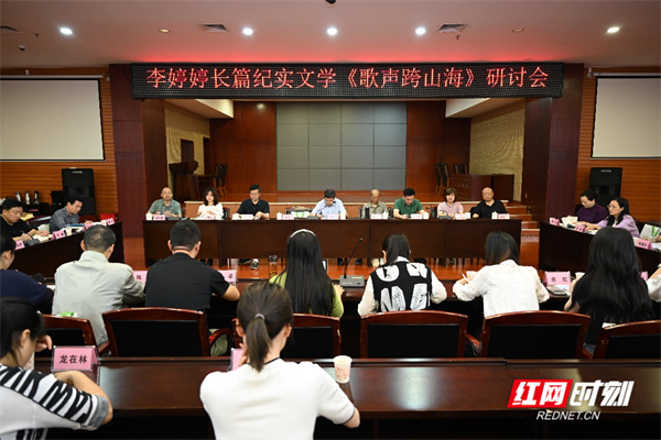 湖南省作协党组书记胡革平出席研讨会,游和平、龚旭东、谢宗玉、沈念、龚盛辉、吴双英、胡隽宓、吴昕孺、邓湘子等数十位文学界、评论界、教育界、出版界专家以及该书作者李婷婷,围绕《歌声跨山海》作品文学性、出版价值、开拓创新等话题展开交流与讨论。研讨会由中国报告文学学会副会长、长沙市作协主席、第七届鲁迅文学奖获得者纪红建主持。