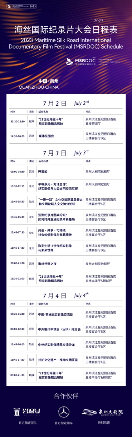 据悉,2023海丝国际纪录片大会有两大特点:第一,国际合作。作为国内聚焦国际交流合作、打造高质量纪录片推介的节展,大会作品集展映、项目推荐、主题研讨、文化体验于一体,此次大会共邀请到7位国际A类纪录片节展主席、12个国家电视台制播机构代表共同参与,开展活动7大类、15场,其中包括5个国际合拍项目合作意向签署仪式、11个中外制作中项目(WIP)提案,还有19部中外精品纪录片展映。大会充分对接中外纪录片制播节展资源,增进中外创作者交流,促进纪实影像的国际合作。第二,海丝特色。泉州作为联合国教科文组织唯一承认海上丝绸之路起点城市,大会落地泉州,充分融合了各种泉州要素,如以泉州为主题的纪录片为案例探讨文化遗产保护的论坛活动、海丝世遗之夜、发现海丝人文之旅、国际传媒人士调研、泉州非遗展示互动区等,让海内外嘉宾沉浸体验宋元中国世界海洋贸易中心的魅力。