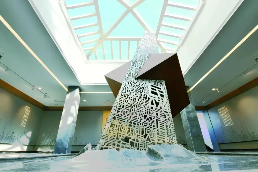 展览序厅的中央设置的艺术雕塑,是一个几何造型金属镂空的三角形装置,由鲁迅著作篇名和名言警句镶嵌连缀而成,下大上小,拔地而起。金属字的棱角表现鲁迅文字的犀利。这可以是一座语言的巴别塔,也可以象征文学家的如椽巨笔。在钢柱的中段,有一个紧箍钢柱但却正被冲破的铁锈正方体,让人联想到《〈呐喊〉自序》中鲁迅与钱玄同那场著名的“铁屋对”。用了三角形,是因为鲁迅曾说过:“生命的路是进步的,总是沿着无限的精神三角形的斜面向上走,什么都阻止他不得。”当然,雕塑的象征意义可以有多重解释,观众可以在这里沉思回想,体会鲁迅精神世界的丰富性和复杂性。