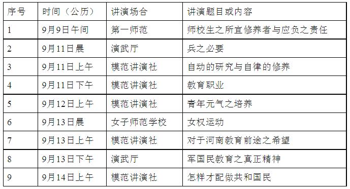 综合以上考证,1922年9月9日至14日,在汴期间梁启超至少发表九次演说,为直观呈现,可列表如下: