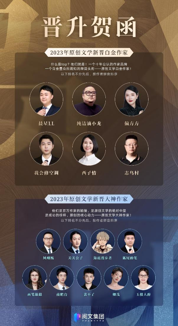 近日,阅文集团发布2023年新晋“白金大神”名单。其中,晨星LL、纯洁滴小龙、偏方方、我会修空调、西子情、志鸟村等6名作者获得“白金作家”称号,凤嘲凰、关关公子、画笔敲敲、海底漫步者、狐尾的笔、南瞻台、裴不了、卿浅、玉楼人醉等9名作者摘得“大神作家”荣誉。至此,阅文旗下白金大神作家人数达458位。