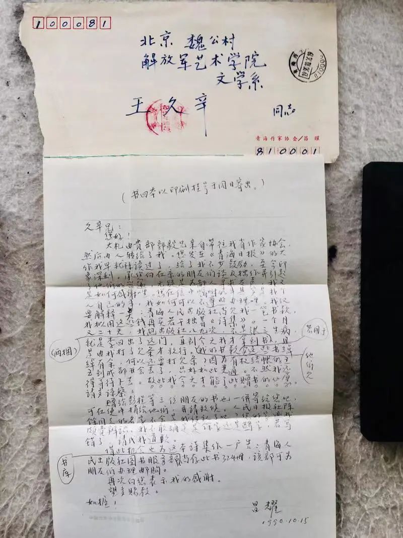 另外,网上同时出售一封昌耀1990年10月30日写给王久辛的书信原件,全文如下: