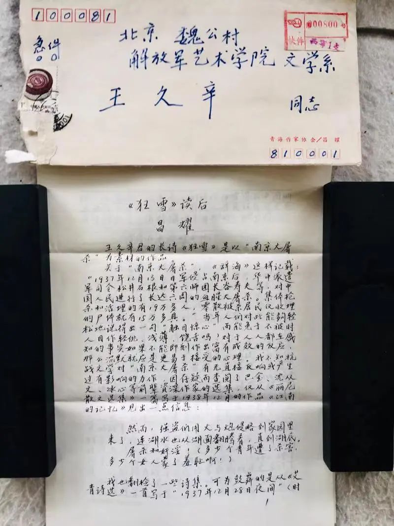 王久辛的长诗《狂雪》在《人民文学》发表后,在国内诗坛得到大家的高度评价,更是在解放军艺术学院文学系产生了很大反响。为此,文学系的老师们提议召开王久辛作品研讨会。著名作家、时任《人民文学》主编刘白羽先生写了一封信,给解放军艺术学院,感谢军艺培养了青年作家、诗人陈怀国、薛晓康、王久辛。《人民文学》程树榛主编带着副主编王朝垠、崔道怡和编辑部主任韩作荣到军艺恭送刘白羽的那封信,并在解放军艺术学院训练部和全院召集的一个大会上进行了宣读。刘白羽的这封信明确表示,《狂雪》是可以流传后世的。当时的训练部长赵骜以及文学系的老师,都说可以开一个研讨会。王久辛听了很激动,第一时间想到应该请昌耀发个言。于是,他给昌耀写了一封信,说军艺准备要开自己的诗歌作品研讨会,如果有可能会请他来。如果没有可能,那就请他写一篇文章。结果,昌耀在深入研读《狂雪》之后,挥笔书写了这篇题为《《狂雪》读后》的诗歌评论,以不负诗友重托。