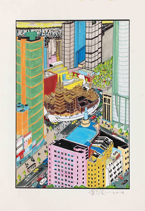 作品《静安寺》绘制的是金宇澄生活、工作的静安区。他说,我画静安寺,发现静安寺周边都是新盖的房子。静安寺很热闹,我画它才醒悟,只有“百乐门舞厅”著名的灰蓝色塔尖,以及静安公园正门两排大梧桐,画外远处张爱玲故居,这老三样。
