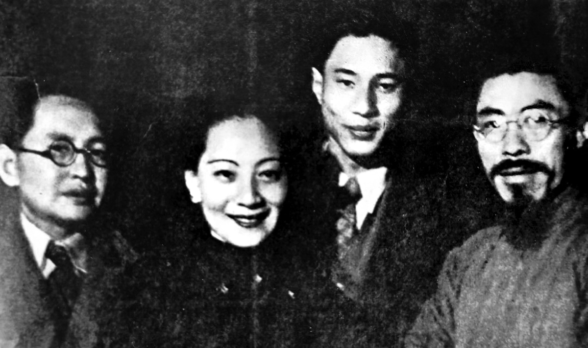 话剧《祖国》主创人员。右起闻一多、孙毓棠、凤子、陈铨(1939年,昆明)