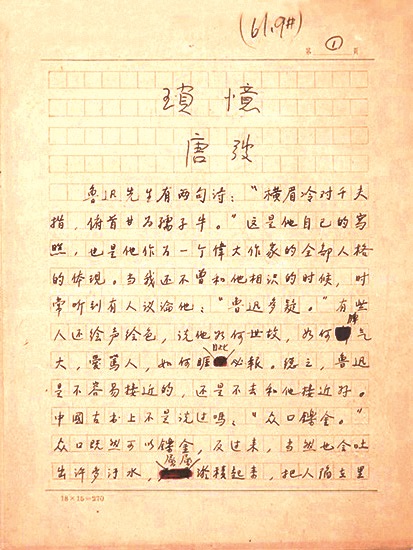 我在中学时就曾学过《琐忆》这篇文章,时隔多年,再次邂逅《琐忆》,却是在中国现代文学馆馆藏珍品中看到唐弢的手书原稿。伴随着少年时的记忆,我再次重读了收录在高中课本上的经典文章。虽然手稿上布满修改和圈涂的痕迹,细细辨认,慢慢读来,却也有一番久别重逢的亲切感。那随处可见的涂抹圈画和比比皆是的修改笔迹,让我在感受到作者字斟句酌、精益求精的严谨之余,倒是比少年时更读懂了作者的良苦用心和他对鲁迅先生的深切怀念之情。