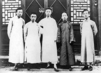 1925年,朱自清与友人在清华园留影,左二为朱自清,左四为俞平伯。初到清华大学三年,朱自清主要讲授“国文”“古今文选”等课程。资料图片