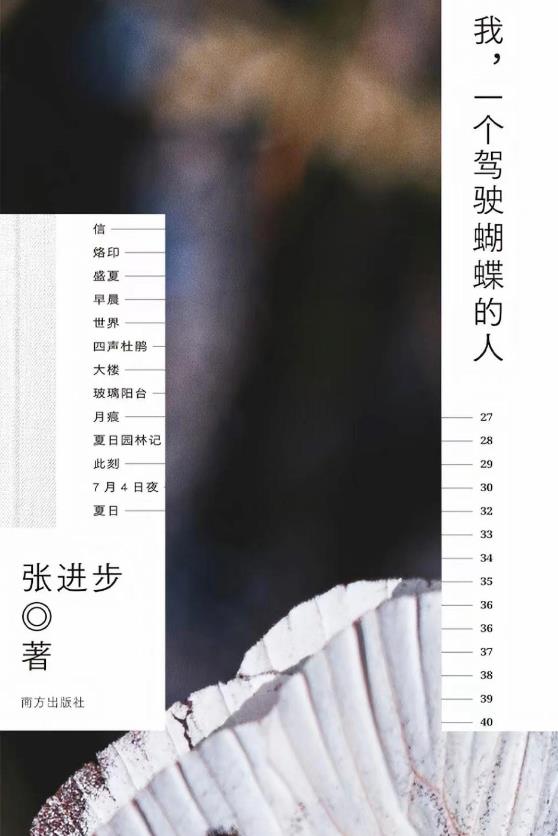《我,一个驾驶蝴蝶的人》是诗人张进步的诗集,收录了诗人创作的127首短诗、1篇诗学随笔、1篇诗人专访。内容分为“菩萨是一阵细雨”“意象戏剧”“世界和它闪光的部分”“秋夜七弦”四辑。在这本诗集中,作者打破规则的藩篱,让万物纷纷涌入笔下,诗歌的内容更加丰富,诗歌的形式也更加自由。其中“秋夜七弦”是一部组诗,每首诗七行,每行都是长句,共20首,每首诗围绕一两个核心意象展开,符合诗人对“意象戏剧”的追求。