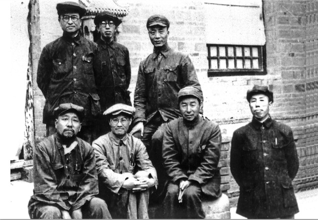 华北联大在张家口时期的合影。前排左起:于力、何干之、林子明、成仿吾。后排左起:沙可夫、刘介愚、艾青
