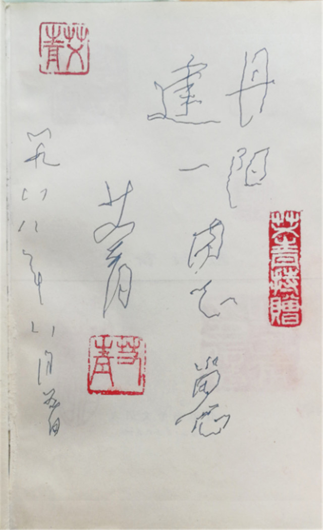 1988年8月5日,艾青伯伯将自己的著作《艾青全集》第一卷赠予我父母后,又将《艾青诗选》赠予我和建一,用颤抖的手在扉页上题写了“丹阳建一同志留念 艾青 一九八八年八月五日”,并盖了章。