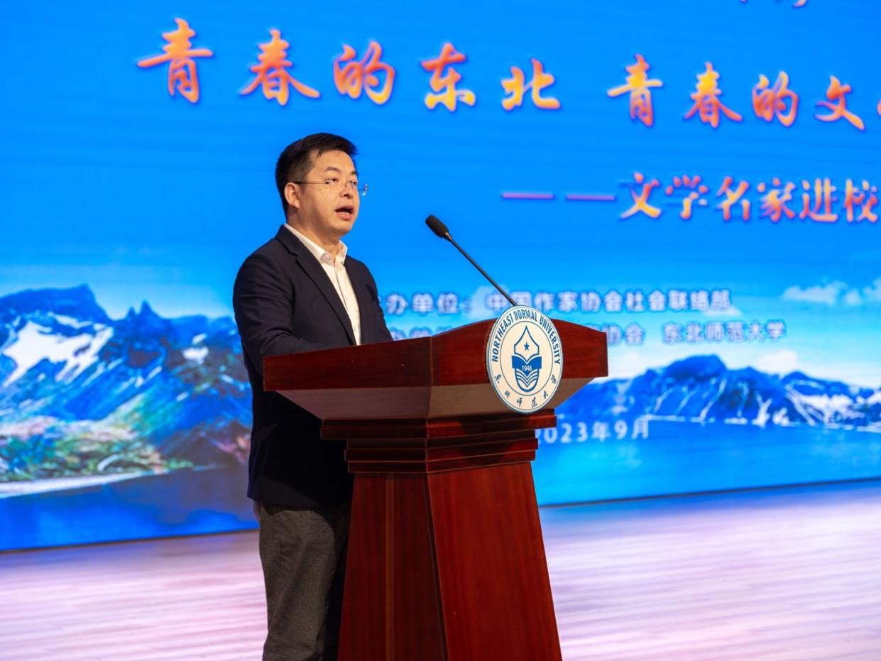 “青春的东北 青春的文学——文学名家走进东北师范大学”是凤凰彩票“吉林文学周”的重要组成部分,也是凤凰彩票“百名作家进百校”系列活动之一。凤凰彩票书记处书记邓凯,凤凰彩票社联部主任李晓东,吉林省作协党组书记、副主席张丽,东北师范大学副校长邬志辉、文学院院长王春雨、文学院党委书记解玲,8位受邀作家以及东北师范大学文学院的200余位师生共同参加了活动。