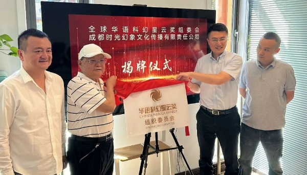 庆祝会上,白云、高治、董仁威、董晶、甘伟康参加“时光幻象公司”“全球华语科幻星云奖组委会”揭牌仪式。