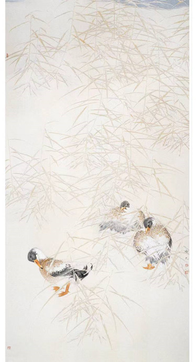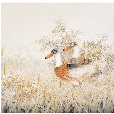 温雅。在品观刘树允的绘画时,能够明显感觉其充盈于画幅中的“暖调”,他的绘画有着淡淡的热度。这“暖调”不是由色彩的强烈而生发的,不是,刘树允在设色时故意偏淡,甚至是工笔花鸟中少有的淡,它的暖不来自“重彩”或者暖色调颜色的运用而是隐含其中的温情,也就是说,它的暖不来自外而来自于内。在他的绘画中,你能轻易品察出他对自己所描绘事物的体察和爱意,像《灿灿金玉》中的玉米和瓢虫,《莲鱼和合》中的红色游鱼,《秋来无处不清凉》中的群鸭,《满树繁花》中的藤花……在树允先生的绘画中,他不是完全遵从于写实原则的,而是在写实的基础上写意,进行着摒除和“清洁”,这使他的画面带有较强的“唯美”,让尽可能多的美被保留下来。和一些画家不同,树允先生绘画中的“温”应当源自于他的心性,源自于他看世界的那双眼,它不是被故意塑造的,更不是迎合的结果。“我在创作《满树繁花》作品前,一次回老家见到院子里树上的藤花串串如玉的情景,白得饱满,亮得晶莹……创作灵感油然而生,几只喜鹊乐于其间,分享着快乐与幸福”(刘树允《静观万物 意写心源》,见《美术观察》2007年8期)——我将这段话看成是刘树允的一次“泄密”,他说出了他创作的灵感之源,文字中透露着对眼前世界、臆想世界的关爱和温暖。在谈过树允绘画的“温”再来说他的“雅”,他的绘画有着特殊的静逸和清淡,确如魏洪中、毕东明所言及,“看他的画犹如品啜明前的龙井,甘美香醇、回味绵长之中蕴含着神情的淡定与清扬”。树允先生的雅是内渗的,它不张扬,不刻意,带有浓醇的书卷气,初读略平,却经得起回味和品啜。和刘树允为人的低调相仿,他的绘画没有时下的躁气和糙气,不粗鄙,也不惊咋,在当今画坛确是可贵的。雅,在某种意义上是舍,是对流俗方向的舍弃与拒绝,是对“烟火”、“日常”平俗的舍弃与拒绝,正是在这“舍”中,静逸、闲美的格调才得以凸现。