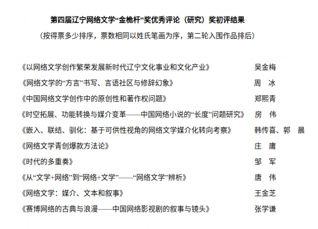 第四届辽宁网络文学“金桅杆”奖·优秀评论(研究)奖初评结果公示