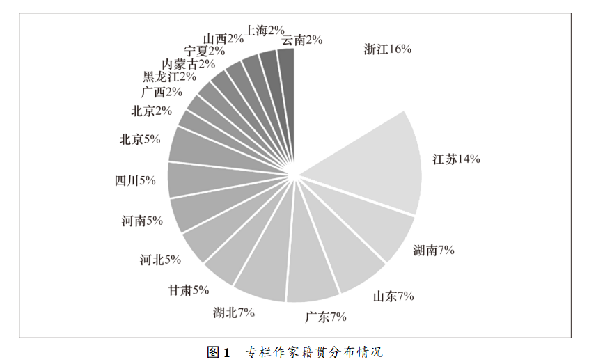 作为个体,每个作家的出身地是无法选择的。从该专栏作家的出生地来看(见图1),他们分别来自19个不同的省、自治区和直辖市,除港澳台地区和贵州、西藏、新疆等地,基本上覆盖了全国大部分地区。