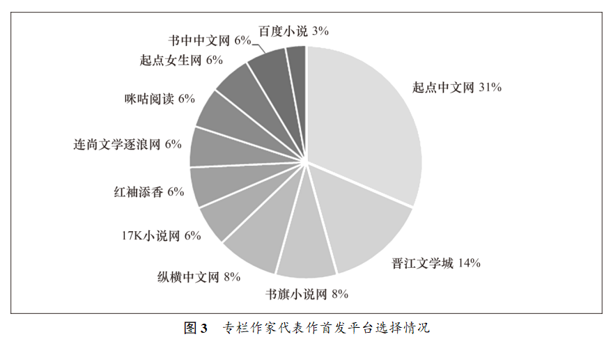 不同的平台有着不同的主题倾向、书写特色和价值追求,同一部作品在不同平台可能遭遇不同的命运,这就要求每个创作者尽可能找到适合自身风格、能够充分展示自己才华与个性的平台。如图3所示,受作品立意、读者偏好、网站运营宗旨等因素的影响,作家们往往不会盲目行事,而是非常有策略地选择合适的网站发表作品。