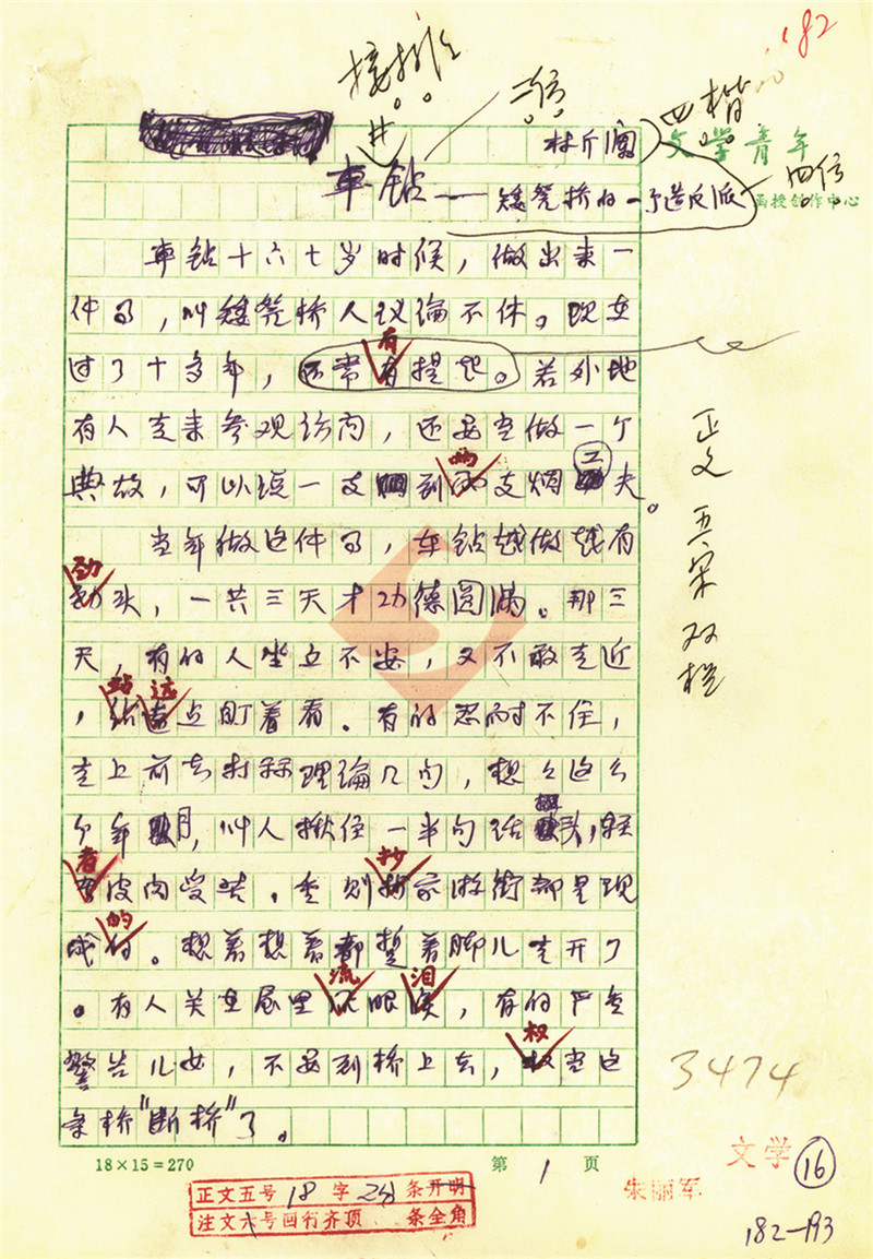 《溪鳗》手稿27页,《车钻》手稿25页,作者均用蓝色圆珠笔书写在“文学青年函授创作中心”“18×15”专用绿格稿笺上。两部手稿均有修改,有蓝、红两色修改字迹,经比对,蓝字是作者手迹,红字是编辑的字迹,或添加或删除,作者都有明显的标识。两部手稿的字迹略显潦草,笔者猜测或许是时间紧,作者匆匆写就,抑或是作者文思泉涌,奔流直泻而作。