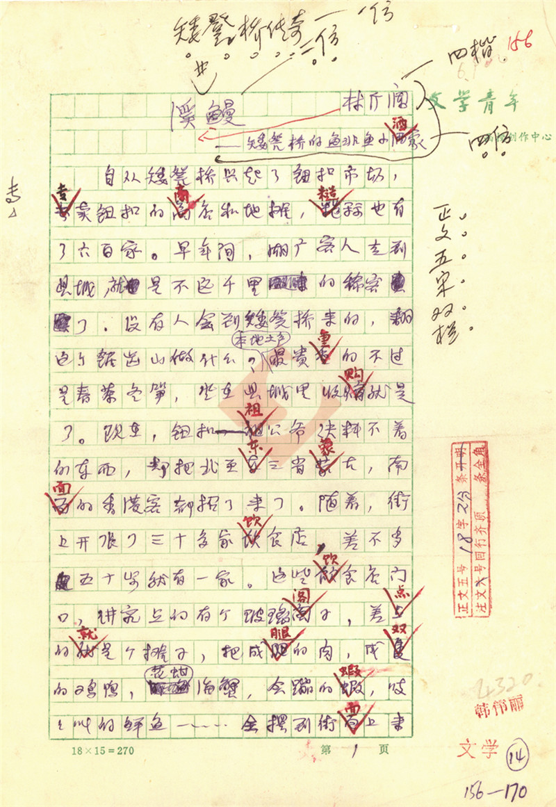 1984年第10期的《人民文学》杂志,同时发表了林斤澜的两部短篇小说《溪鳗》和《车钻》,这是他“矮凳桥风情系列”小说中的两篇。“矮凳桥风情系列”由21篇中短篇小说集结而成,以温州“矮凳桥”为背景,人物和情节互有联系,又独立成篇,是中国当代文学史上短篇小说的代表作。中国现代文学馆藏有《溪鳗》《车钻》《李地》等多部“矮凳桥”系列小说手稿,多为《人民文学》杂志社捐赠。从“人民文学稿笺”可以看到编辑的刊发意见:“若两篇同期发,可请作者自己考虑一个总标题。”《溪鳗》手稿首页上端中间位置有“矮凳桥传奇”字样,明显是编辑后加上去的,这应该就是“矮凳桥风情系列”的前身了。【详细】