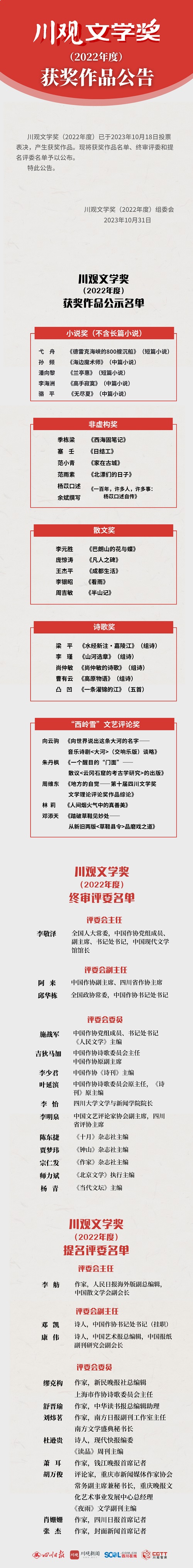 10月31日,川观文学奖(2022年度)组委会发布公告称,川观文学奖(2022年度)获奖作品已于2023年10月18日评选产生,并于10月27日至10月30日进行公示,共有25件作品分获川观文学奖(2022年度)小说奖(不含长篇小说)、非虚构奖、诗歌奖、散文奖、“西岭雪”文艺评论奖。据了解,2022年度川观文学奖颁奖典礼将于今年底在成都举行。