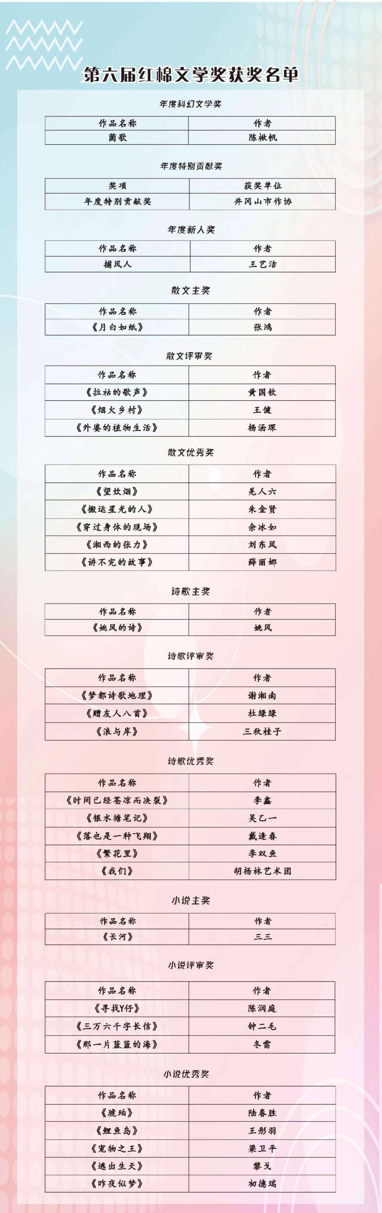 由广东省作家协会指导,深圳市作家协会,龙岗区文学艺术界联合会,中共深圳市龙岗区横岗街道工作委员会、深圳市龙岗区横岗街道办事处联合主办的第六届红棉文学奖,从4月开始面向全国征稿,累计收到来自全国各地参赛作品5600多篇/部,经评审委员会评选,获奖名单出炉。