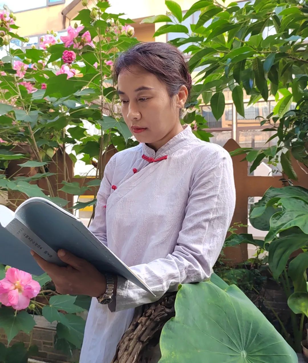 抵达班洪抗英遗址园的时候,已经是午饭时间,簇拥遗址碑的鲜花开得正艳丽,赛金老支书和岩团老支书刚好关上了值班室鲜红的大门,正准备去吃午饭。